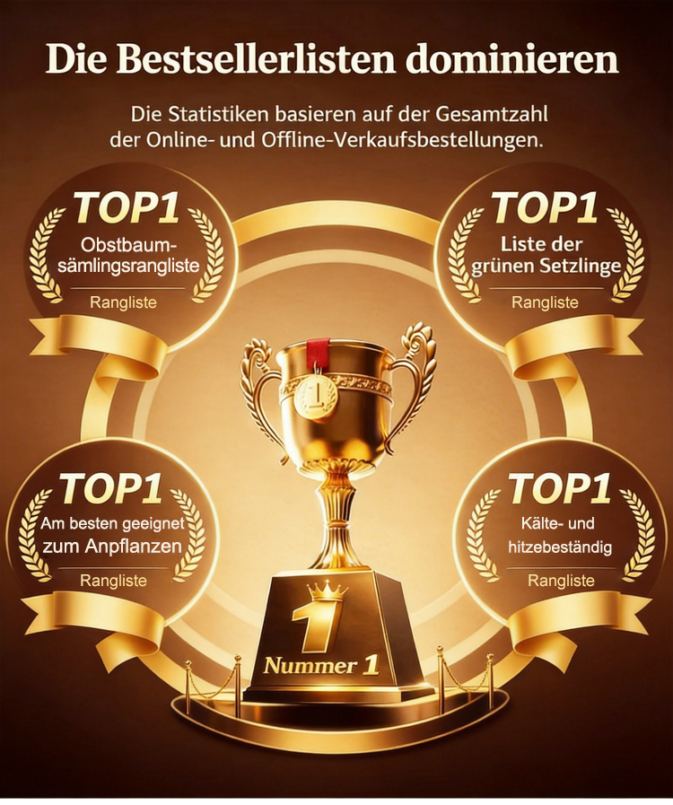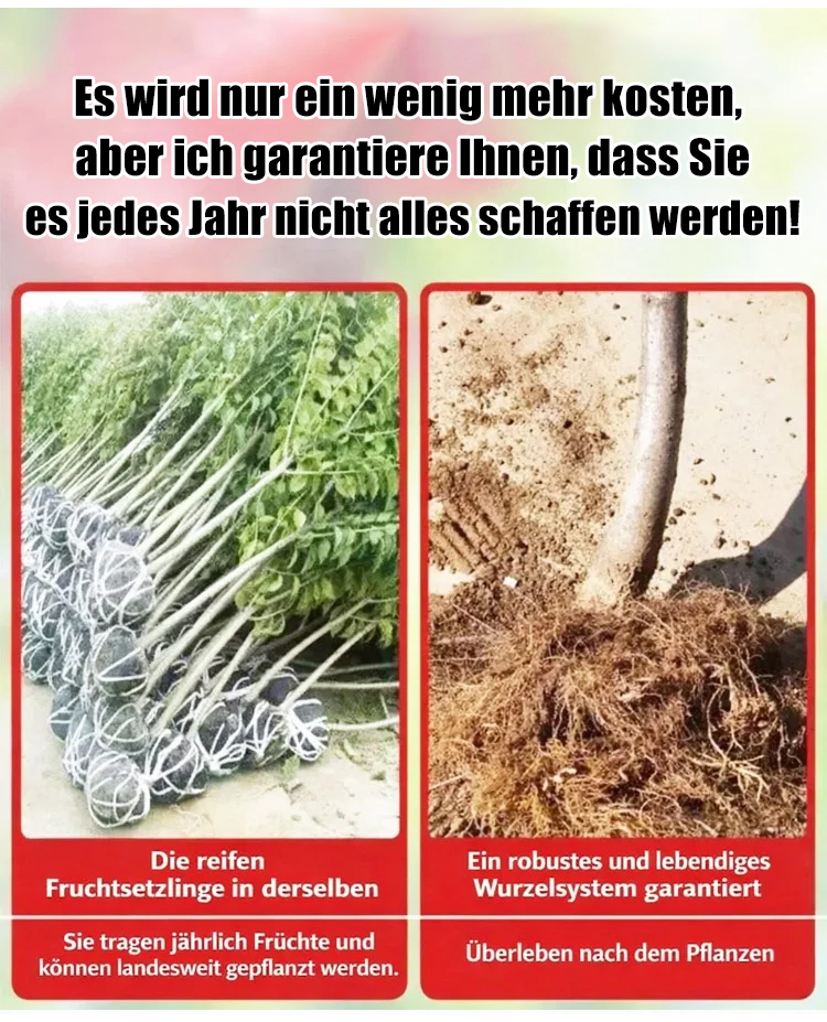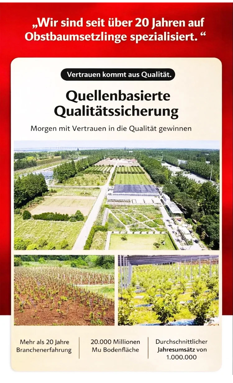 Diese 3 Jahre alten Setzlinge haben eine Überlebensrate von 99,9 %! Schon ein einzelner Baum kann bestäuben und Früchte tragen – für eine erstaunliche Ernte! Reich an Nährstoffen, fördern sie die Gelenk- und Herz-Kreislauf-Gesundheit! Sie unterstützen die Entgiftung und sorgen für ein schönes Hautbild! Große, saftige Früchte, die der ganzen Familie schmecken!